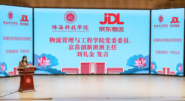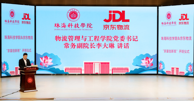 开班仪式上,物流管理与工程学院党委书记、常务副院长李大琳对学校的关心支持,对京东物流的积极合作表达了感谢。李大琳首先回顾与京东物流的合作历程,并介绍了本届“京苗创新班”的筹备背景、历程以及其对学院物流行业应用型人才培养的意义和价值。他对开班仪式现场的同学们提出了殷切期许,他希望同学们在接下来的学习中,以“京苗”之姿向阳生长,成为懂技术、会管理、有担当的物流行业栋梁;期待与京东物流继续携手,在人才培养、技术创新、社会服务等领域结出更多硕果,为粤港澳大湾区物流产业高质量发展贡献更大力量。