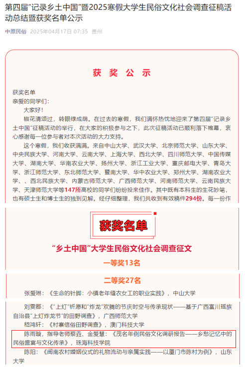 近日,第四届“记录乡土中国”暨2025寒假大学生民俗文化社会调查征稿活动落幕。本届征文大赛共吸引了全国147所高校本科生、硕士生和博士生投文参与,累计收稿294份,经过层层评审,共评出一等奖13名,二等奖27名,三等奖37名。我校商学院2024级会计学专业学生陈羽璇的《茂名年例民俗文化调研报告——乡愁记忆中的民俗盛宴与文化传承》获二等奖,马克思主义学院教师蔡垚、金爱慧担任指导教师。
