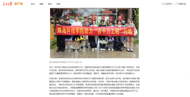 5月12日,人民日报客户端广东频道对珠海市高校联动区镇助力“百千万工程”工作进行了报道,报道中详细介绍我校作为一所学科门类较为齐全的应用型大学,积极引导教师围绕“百千万工程”开展产学研合作,支持产业发展,推动科研成果转化,服务地方经济社会发展。通过加强与共建区域的联系与合作,为区域产业发展提供了大量高素质基层人才,促进传统产业向智能化、绿色化、高端化转型升级,助力新兴产业发展壮大。