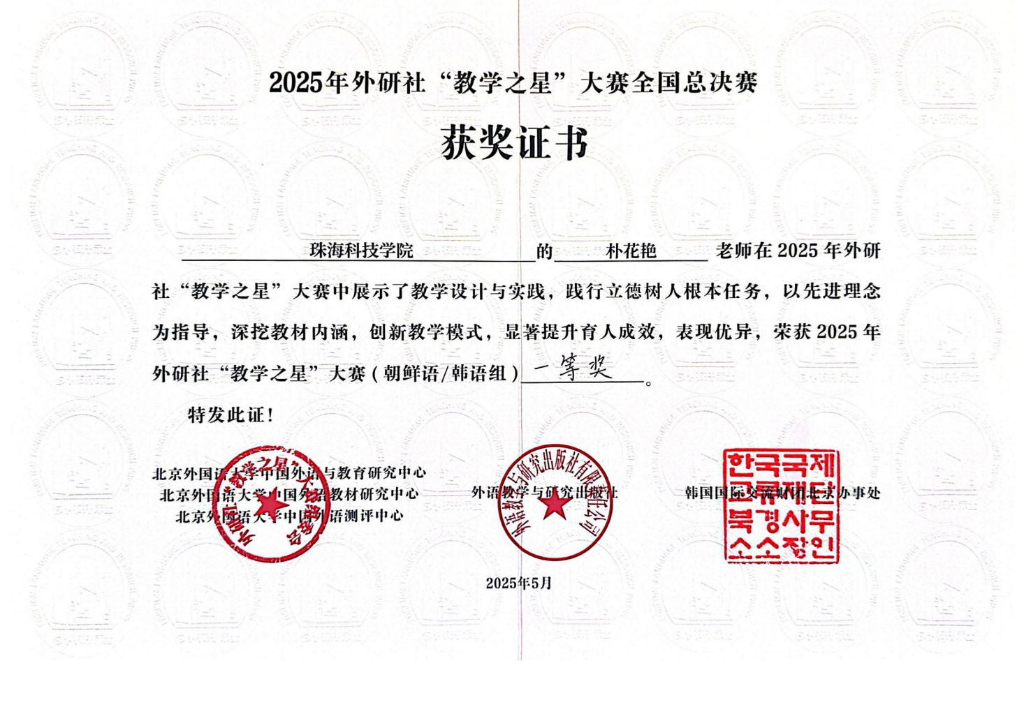 2025年6月8日,外研社“教学之星”大赛韩语组全国总决赛圆满落下帷幕,我校朝鲜语专业教师朴花艳凭借出色的综合实力脱颖而出,荣获一等奖,为学校赢得了荣誉。