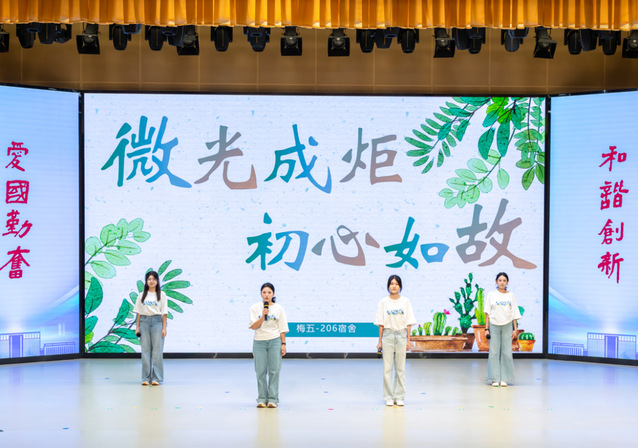 在特色宿舍展示环节,来自商学院梅五-206宿舍的同学们为在场师生带来的作品《微光成炬,初心如故》,以志愿初心为纽带通过温馨的场景演绎和深情讲述展现了宿舍成员间因公益而结缘的深厚情谊,也生动诠释了宿舍文化蕴含的温暖力量。