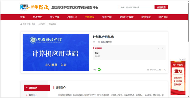 “计算机应用基础”课程入选新华网新华思政示范课程