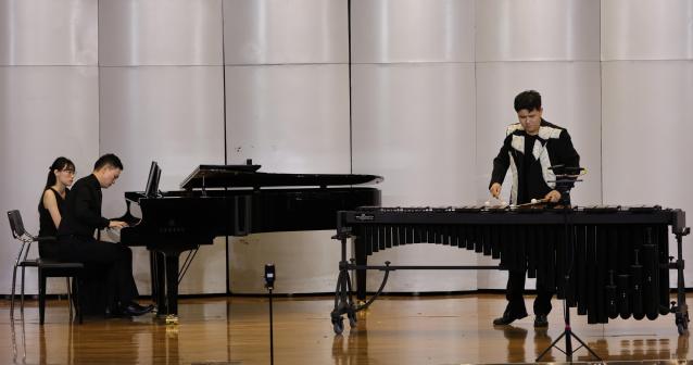 音乐会以中国打击乐重奏《古风》启幕,铿锵的节奏与层次分明的音色勾勒出古朴悠远的意境——鼓点似山间松涛,钹音若溪涧流泉,领奏与乐团的呼应间,“古风”之韵扑面而来。随后,《大曲》以竹笛与钢琴的跨界对话尽显北方民族的粗犷豪情,高音透亮、低音沉厚,展现出当代竹笛创作的突破与张力。黄泰龙老师与蓝卓茜、廖华钦、傅婕三位同学携手演绎《将军行》,大堂鼓的雄浑音色交织成网,四重奏的默契配合将“将军百战”的豪迈具象化:鼓点疾徐如战马奔突,强弱变化似刀光剑影,打击乐的磅礴气势震撼全场。西方经典《威尼斯狂欢节》则在笛声中焕发新声,灵动跳跃的旋律加以张翔老师钢琴的点缀,呈现出一场盛大的狂欢盛宴。